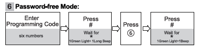 First, you can enter “programming code”, second press “#” button, then press ”6” button, finally press ”#” button and complete the [Password-free Mode] setup.